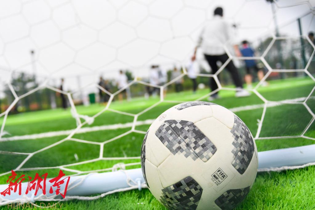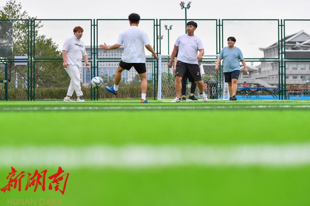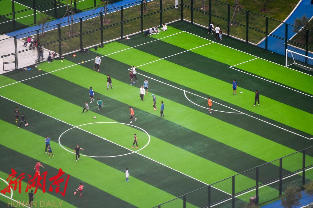 图为:在延边朝鲜族自治州延吉市阿里郎足球公园 市民在球场踢球