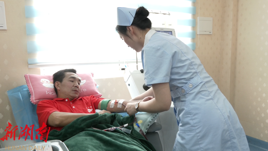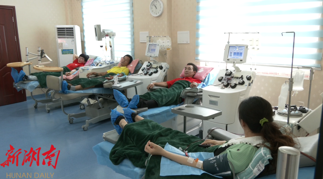 6月14日是世界献血者日,廖振飞一大早就来到邵阳市中心血站,进行第102次无偿献血。体检、化验合格后,廖振飞熟练地坐上采血椅,开始捐献两个治疗单位的血小板。