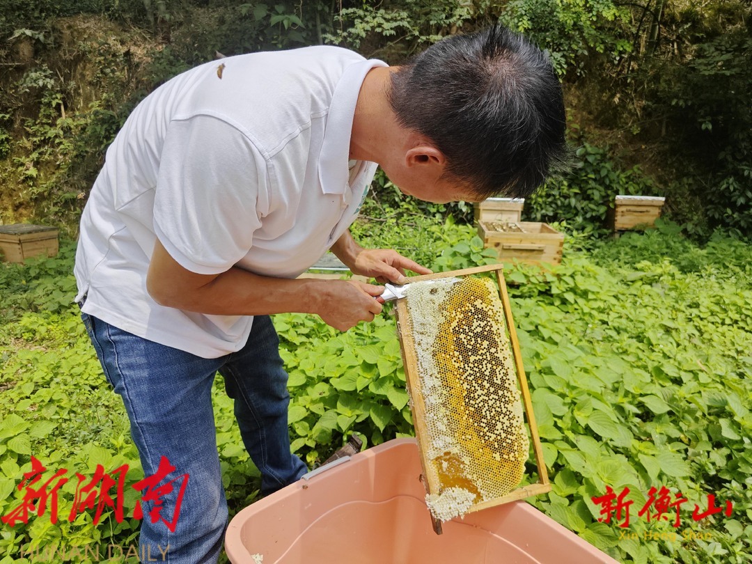 衡山县融媒体中心6月15日讯【记者:唐有权 谭芳丽 谢芳】为壮大村集体经济,增加村民收入,新桥镇新桥村依托山区树茂花繁、蜜源丰富这一得天独厚的自然资源优势,积极发展“一村一品”特色产业——蜜蜂养殖。当前正值六月,村里的蜂蜜迎来了高产期。