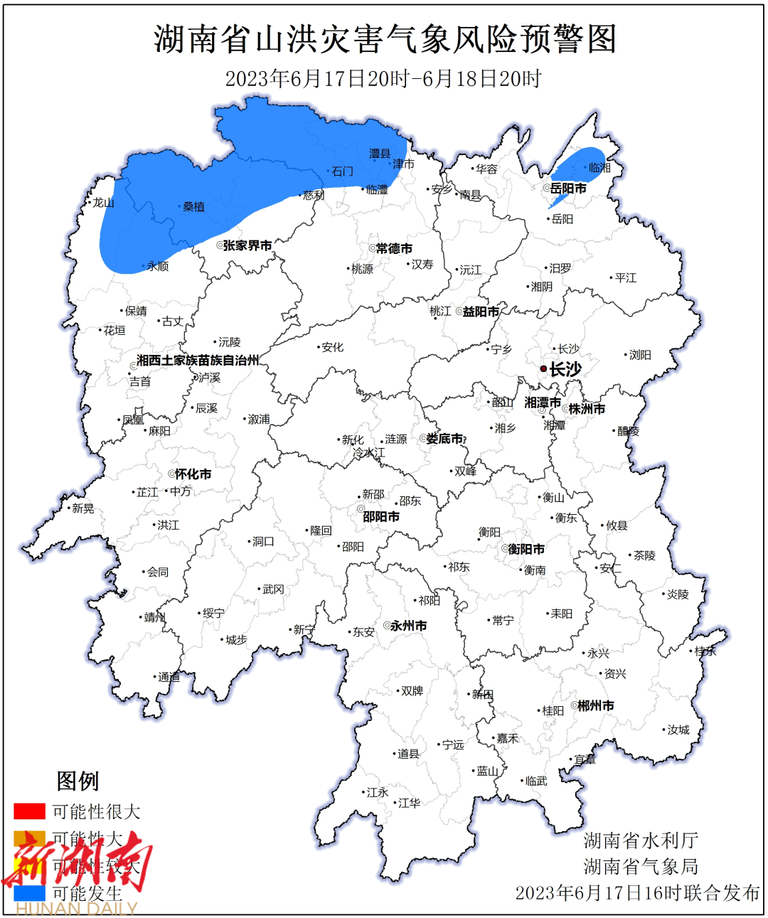根据湖南省气象台6月17日短期气象预报情况,湖南省水利厅与湖南省气象局联合会商得出如下结论:自6月17日 20:00至18日20:00,受降雨影响,岳阳市、湘西自治州、张家界市、常德市等局地可能发生山洪灾害(蓝色预警)。