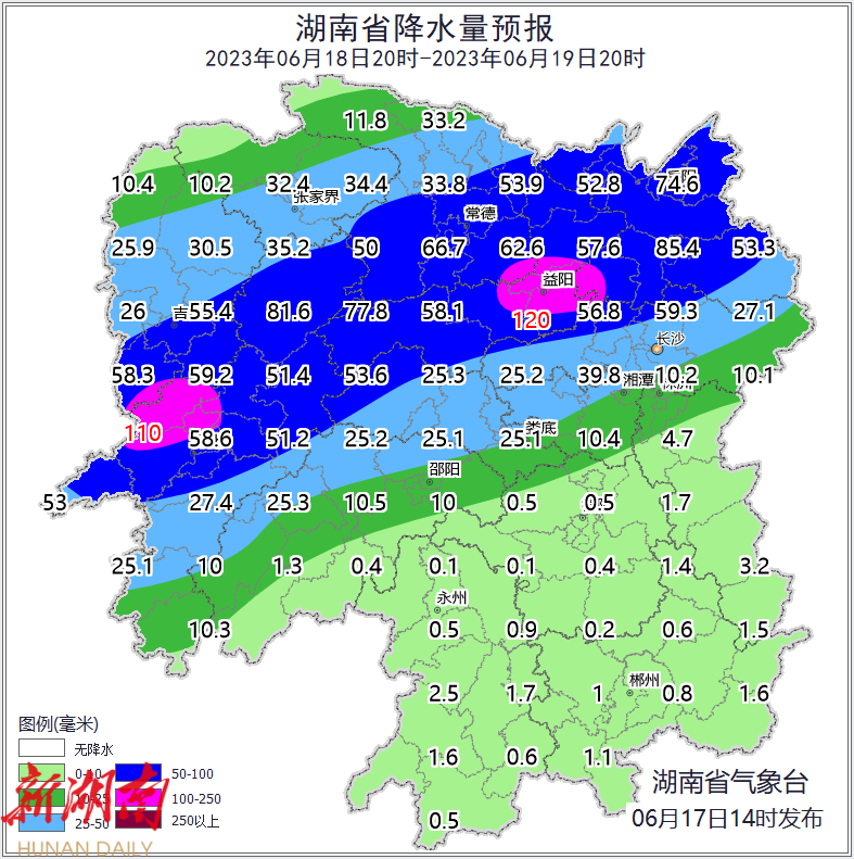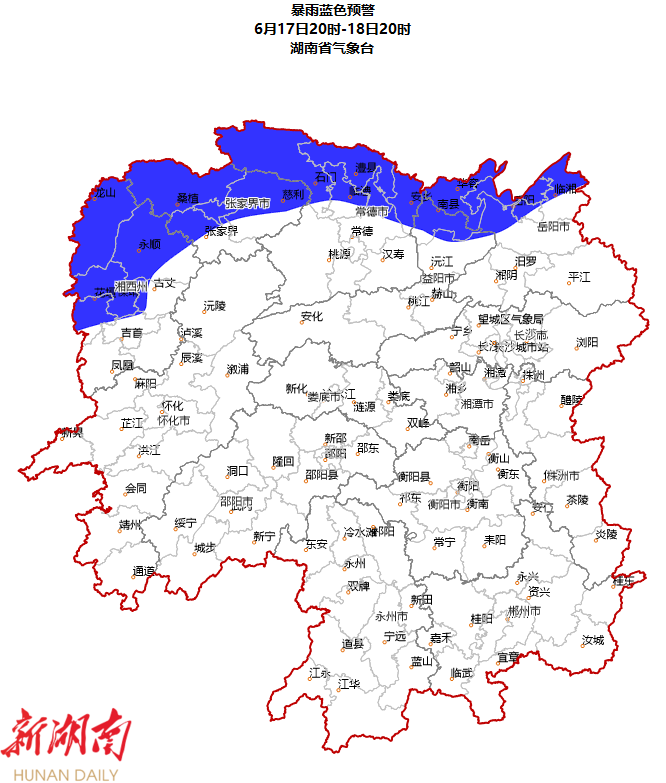 湖南省气象台6月17日16时发布暴雨蓝色预警: