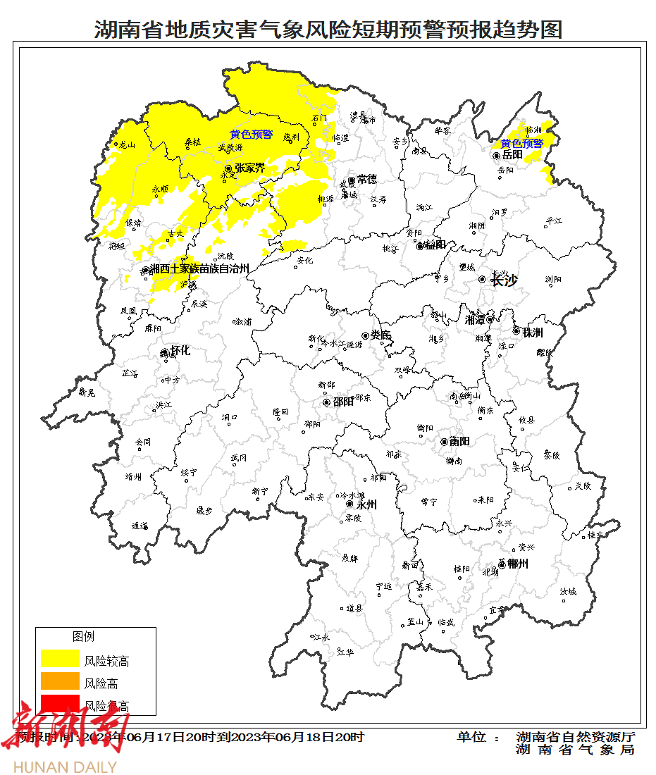 根据地质灾害成灾规律和孕灾条件,结合6月17日短期气象预报情况,省自然资源厅与省气象局联合会商得出如下结论:自6月17日20:00至18日20:00,受降雨影响,湘北部分区域发生突发性地质灾害风险较高(黄色预警)。