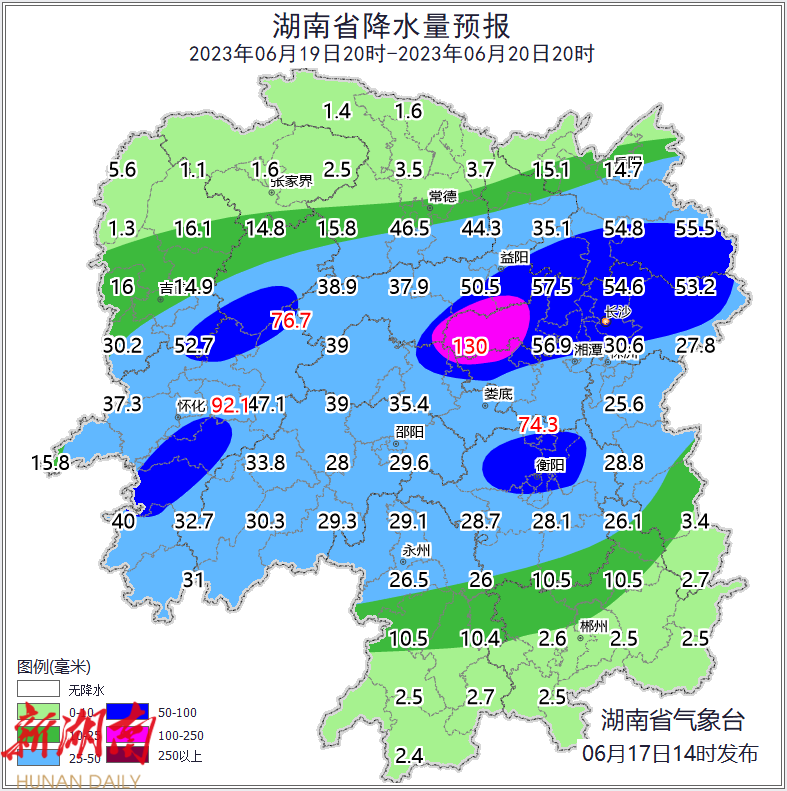 湖南省气象台预计,未来一周,湖南强降雨带将呈阶段性南北摆动,雨势强、累计雨量大。 其中17日晚至20日白天, 湘北、湘中部分地区 将出现暴雨到大暴雨, 并伴有短时强降水、雷暴大风 等强对流天气, 需注意防范。