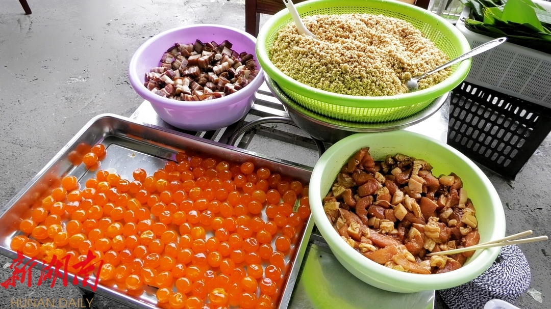 在古丈沿河北路的一个社区里隐藏着一家手工粽制作坊,该作坊并不在热闹街市,粽子却小有名气。走进作坊内,只见粽叶、糯米、蛋黄、腊肉等原材料在案台上一字排开,空气中不时飘来淡淡粽香。“现在包肉粽,先加酱油,再加生抽,让我们肉粽吃起来具有酱香的味道。”作坊老板一边调味,一边说道。