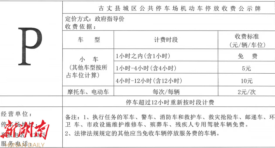 为进一步规范停车服务和收费行为,合理调控道路交通需求,5月24日,古丈县发改局发布《进一步调整机动车停放服务收费管理有关事项的通知》,6月1日起执行停车收费新规,在停车收费上做起了“减法”。新规施行后免费停车时间由半个小时延长到1个小时,执行政府指导价的公共停车场24小时限价20元,收费道路临时停车泊位24小时限价25元。