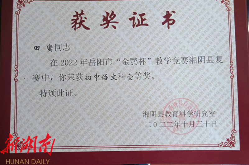 2020年,湘阴县调整师资配置,原则上要求体制内教师回归公立学校。消息一出,田蜜积极响应,主动辞去工资绩效待遇丰厚、当时还是私立学校的长郡城东学校。县教育局为其开具了第一份调令。 就这样,田蜜调配到县城关中学继续任教语文兼班主任,从初一跟班到今年毕业。