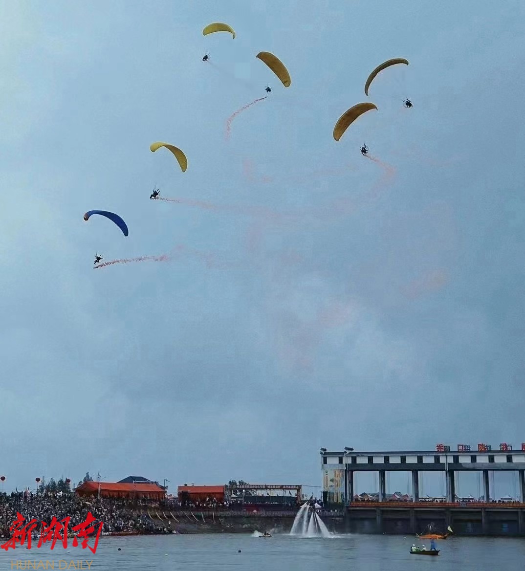 端午节的柳林江岸红旗招展,人头攒动,江中碧波荡漾,龙舟飞渡、百舸争流,这既是历史和文化的融合,也是水上“速度和激情”的碰撞。现场,龙舟祭祀上香、“画龙点睛”、诵祭文、合兴大鼓、诗联学会助兴、水上花样表演、滑翔伞列队表演等精彩环节依次呈现。