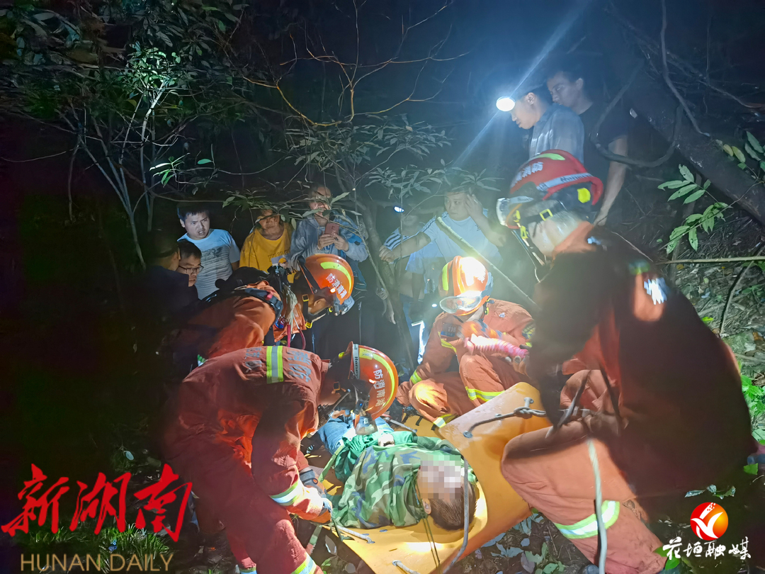 20时20分,消防救援人员到达现场,立即组织营救被困人员。在做好个人防护后,救援人员迅速将山岳救援绳放下悬崖,然后带上多功能担架、安全吊带等救援装备,在知情村民的指引下穿越2公里山林前往被困人员所在位置。此时被困男子已被先期赶到的村民从悬崖底部抬了出来,但由于腰部、腿部伤势较重,无法自主行走,且救援现场断崖交错、杂草丛生,路况非常复杂,村民只能在原地等待救援。