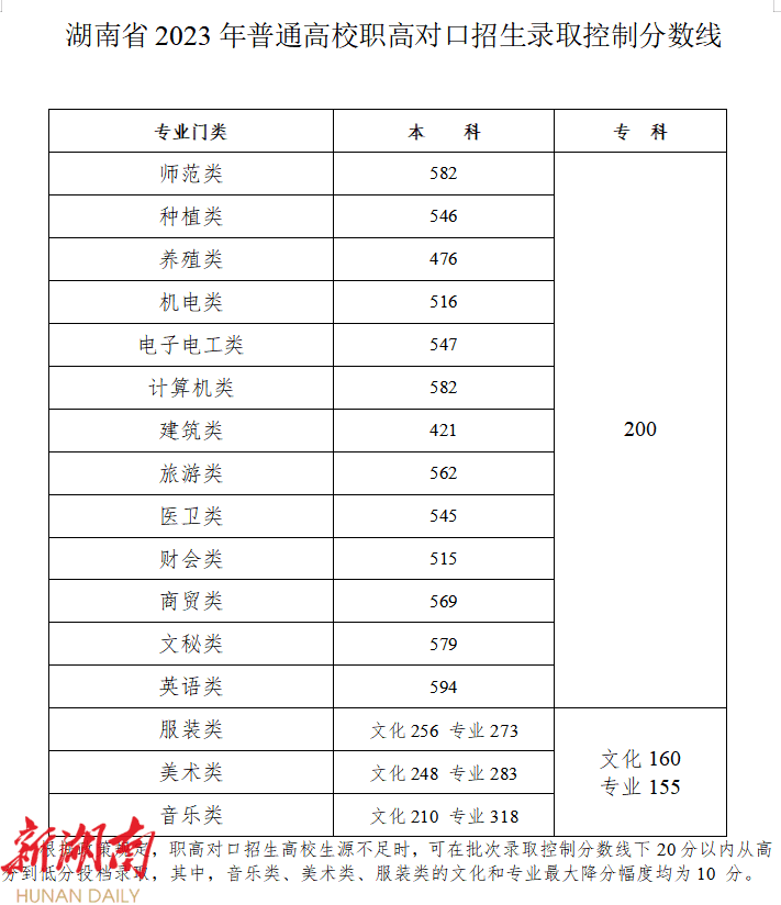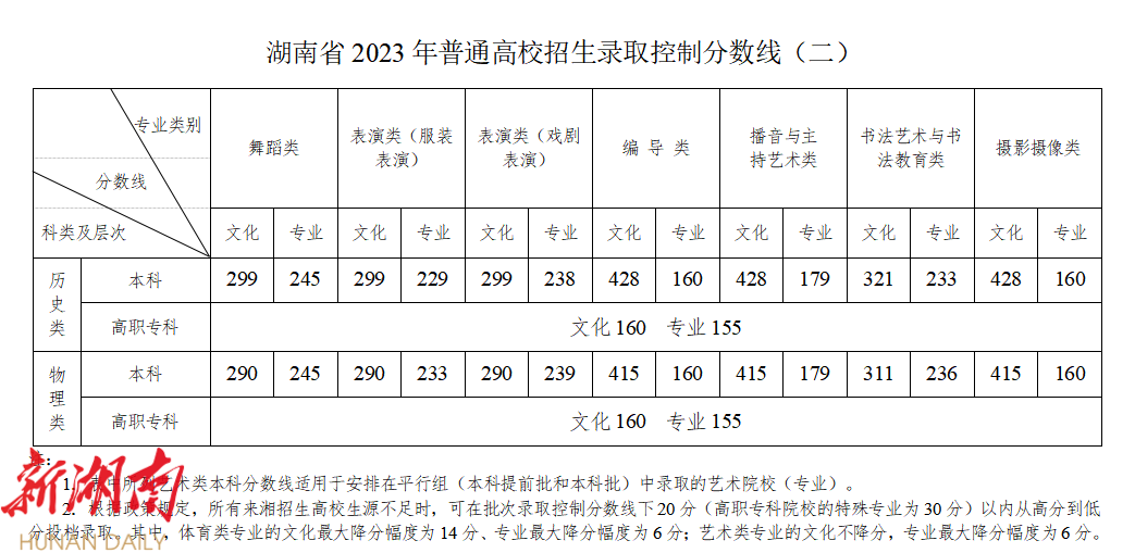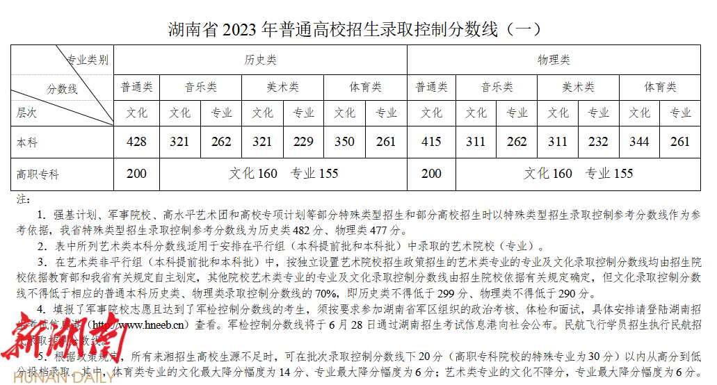 今天上午,在2023年湖南高考新闻发布会上,湖南省教育考试院公布了今年各批次录取控制分数线。其中,历史类本科线为428分,专科线为200分;物理类本科线为415分,专科线为200分。此外,特殊类型招生录取控制分数线为历史类482分、物理类477分,该分数线将作为强基计划、军事院校、高水平艺术团和高校专项计划等部分特殊类型招生和部分高校招生时的参考依据。