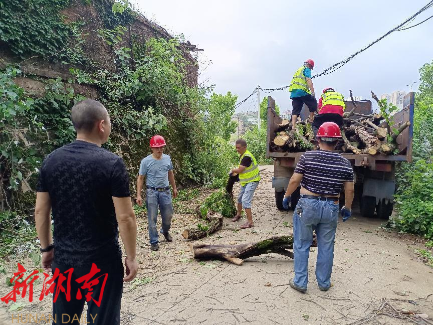 因端午节假日期间衡阳频繁出现暴雨、大风等恶劣天气,担心围墙上的枯树枝被风吹下来砸伤路人,七里井社区紧急联系石鼓区园林部门,利用端午假期加班加点,清除有机合成围墙上的枯树、杂树,保障道路安全通行。