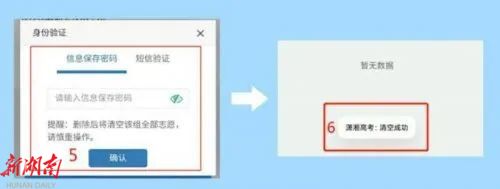 输入“信息保存”密码或手机短信验证码,点击[确认]。删除操作成功后,会出现“潇湘高考:清空成功”提示信息。