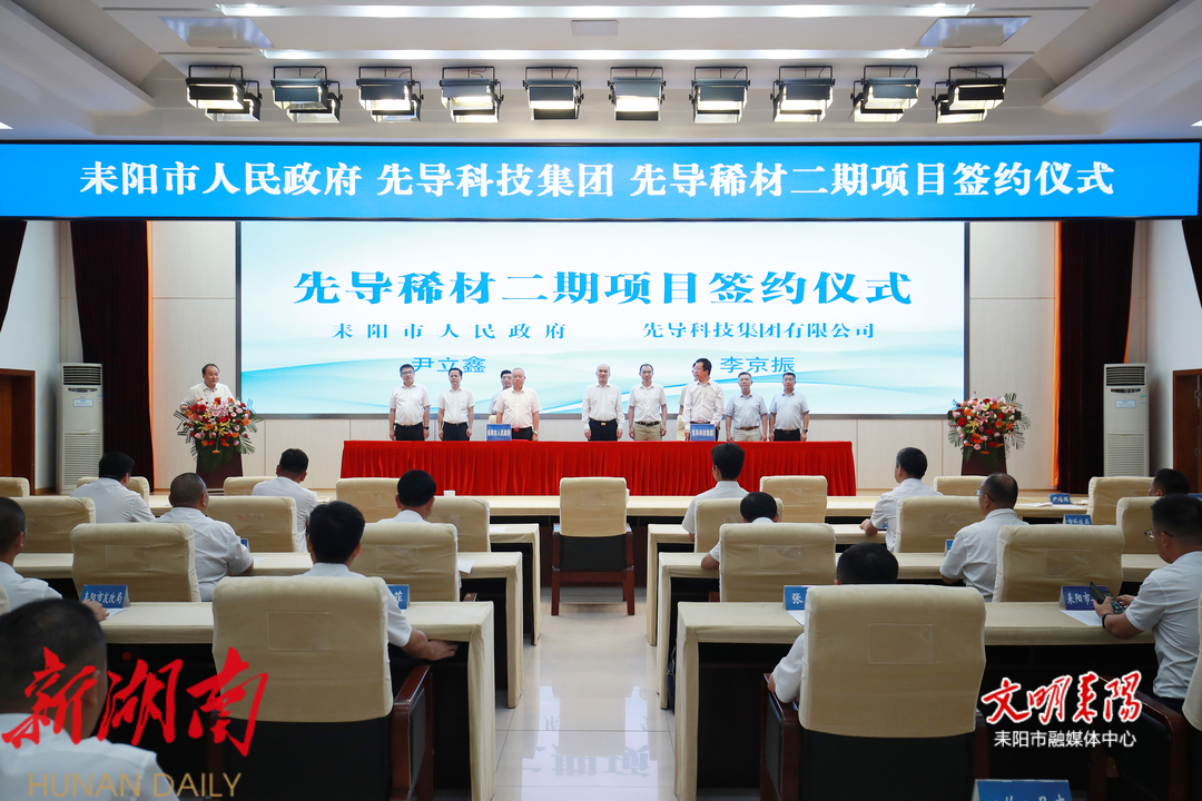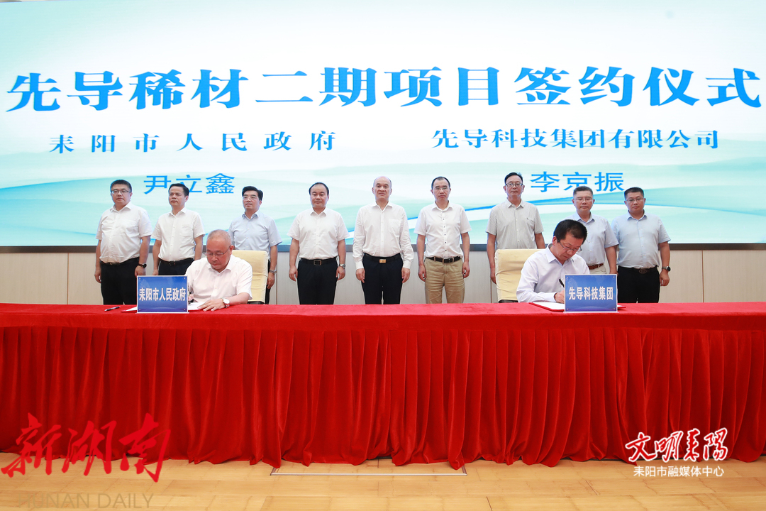 6月30日下午,耒阳市人民政府与先导科技集团先导稀材二期项目签约仪式在衡阳举行。衡阳市委书记刘越高,先导科技集团董事长朱世会见证签约。衡阳市委副书记、市长朱健主持签约仪式,衡阳市委副书记、耒阳市委书记赖馨正致辞,衡阳市领导尹培国、朱春光出席。