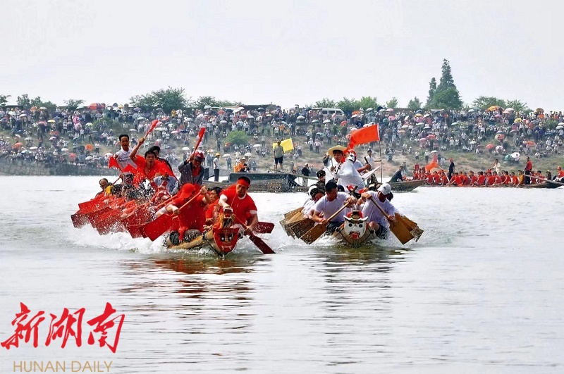 这边,红船早已下了头桡,激起的浪花夹着火铳的轰鸣,像归巢的水鸭冲着洲头直飞而来。右舷的小白龙毫不含糊,齐心协力,喝声震天,平日里白衫立领,撑伞扶钊的老艄公此刻也双手紧紧地握住钊柄,全神贯注,凝视前方。左边老黄龙总指挥手中的“银蛇点青篙”已是漫天飞舞,雄姿飒飒了,像极了当初杨幺力挫宋军,威震八方的大胜场面。正当三条神龙拼过半河,似离弦之箭向岸边飞驰之际,斜刺里又杀出一条乌龙来,黝黑黝黑的,落桡齐整,下水有力,气势如虹,奋勇直追。