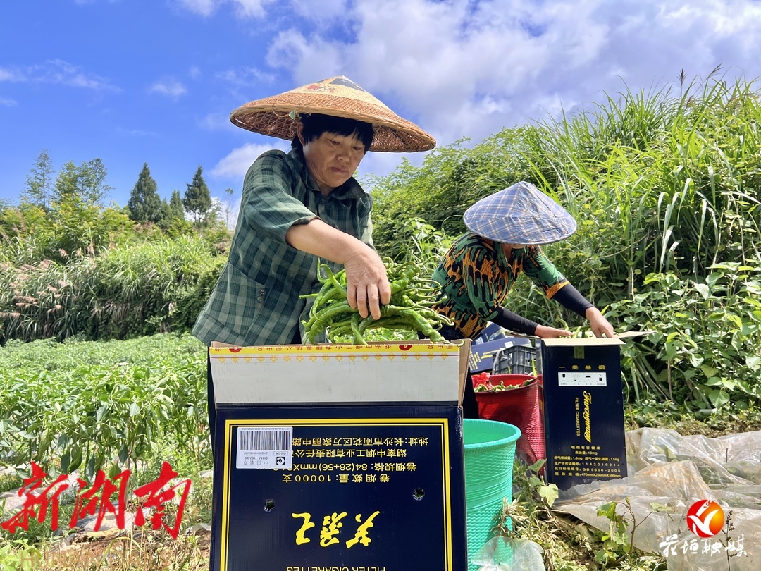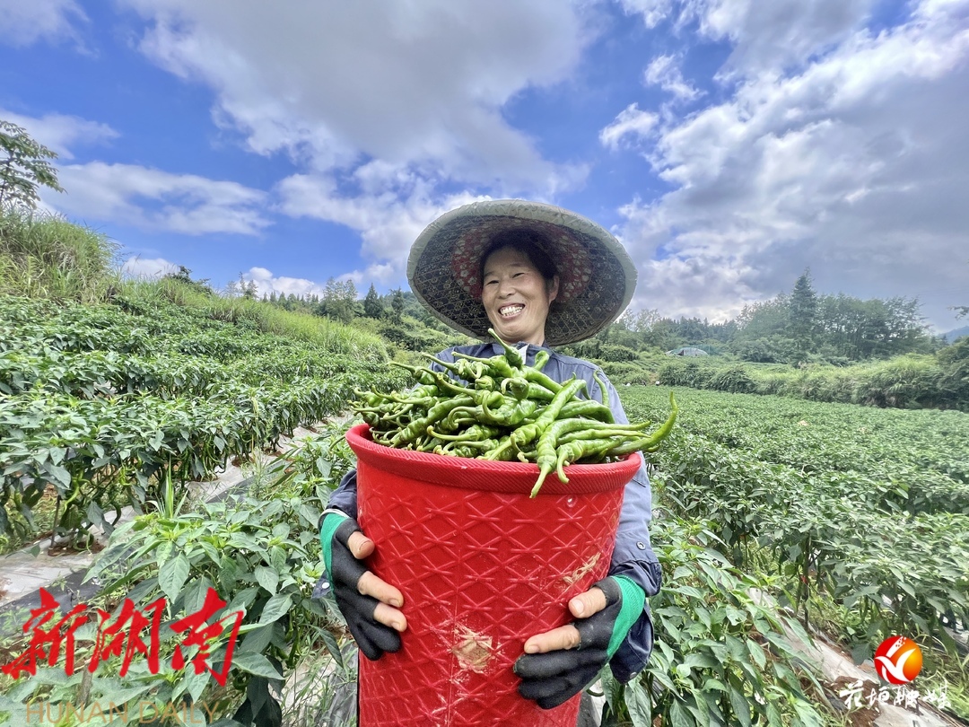 7月5日,记者走进辣椒地里看到,工人们头戴草帽,正忙着采摘新鲜辣椒准备装车运往长沙。