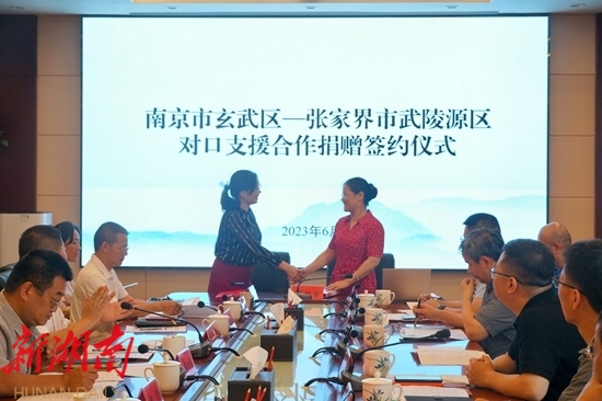 在交流座谈会上,李湘耀、吴恒分别介绍了两地经济社会发展情况,玄武区红十字会、武陵源区红十字会签订对口支援合作捐赠协议书,双方还就教育资源配置、森林康养产业、研学旅游规划、景区医疗设备配置等方面进行深入探讨,互相交流经验。