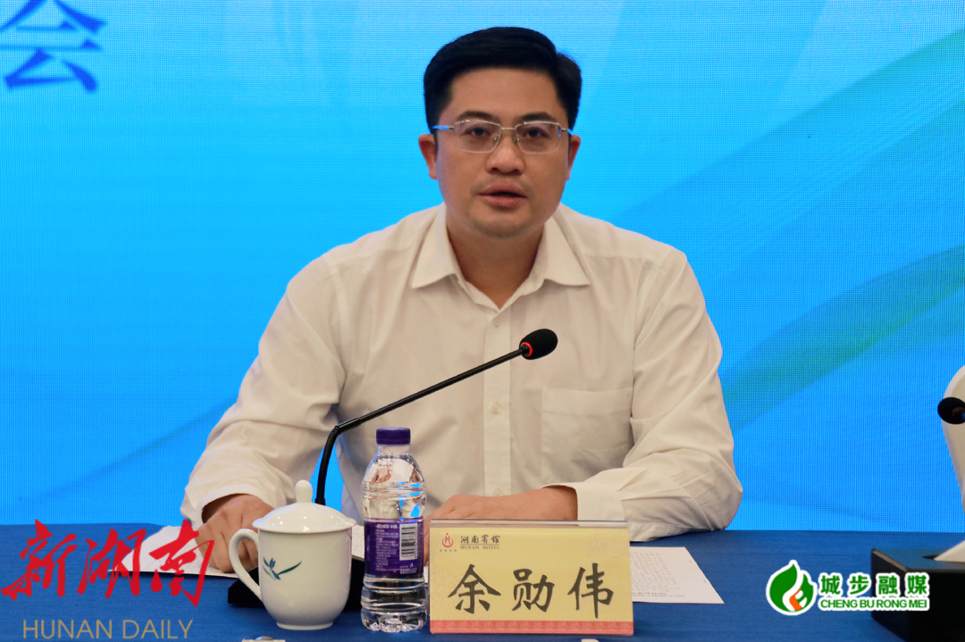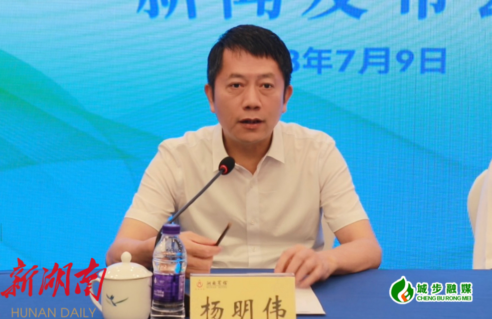 图为湖南省商务厅二级巡视员杨明伟在发布会上答记者问