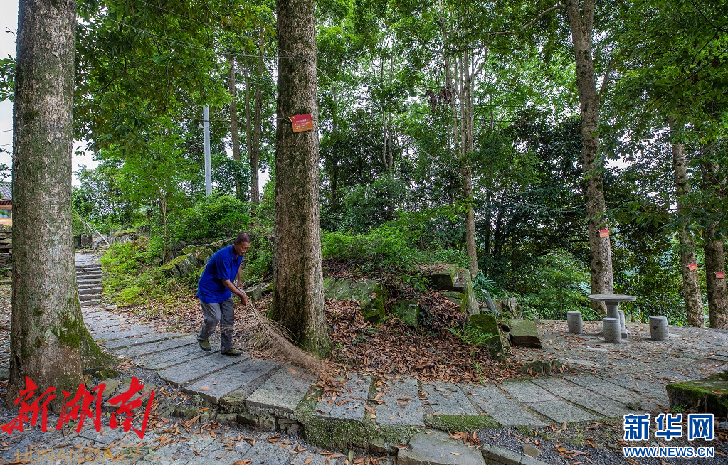 图为陈代全正在清扫落叶,楠木林为他家的农家乐带来大量客源。