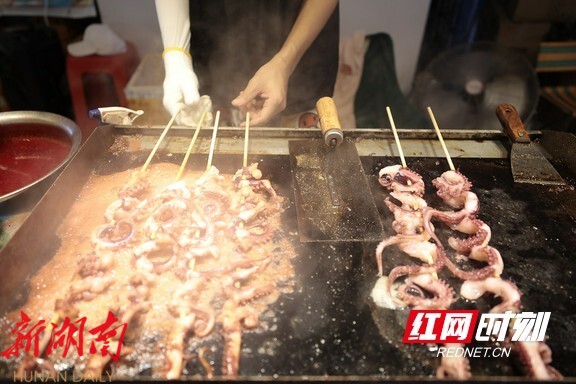 7月11日晚,衡阳火车站广场的缤纷美食集市灯光璀璨,美食飘香,浓郁的人间烟火气弥漫于空中、浅尝于舌尖、满足于心田。在人声鼎沸中,市民们在夜市中探索各种美食,一排排摊位整齐排列着,特色烧烤、凉粉、螺蛳粉、火爆鱿鱼等各种小吃应有尽有,到处都是欢声笑语。