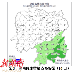 16 日 ,湘南多云间阴天有小到中等阵雨或雷阵雨,其他地区晴天间多云(图3);最高气温34~36℃。