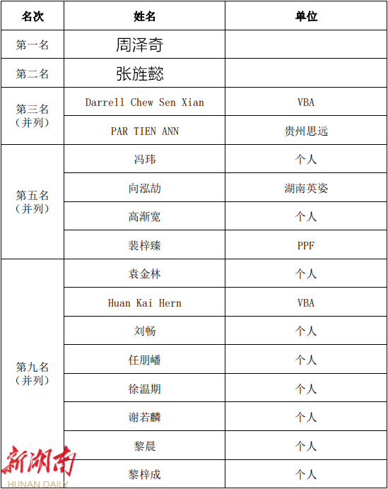 2023郴州“湖南银行”林丹杯羽毛球公开赛吸引了来自中国、马来西亚、英国等9个国家和地区的近千名选手参赛。经过为期3天的角逐,决出了公开组、混合团体组、青少年组各组别名次(名单附后)。 其中,在最受瞩目的公开组男子单打决赛中,周泽奇夺得冠军,捧得“林丹杯”!