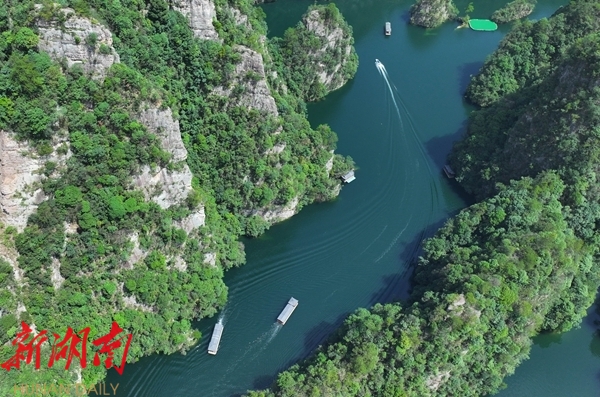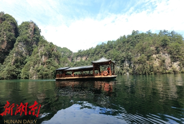 湖南日报·新湖南客户端7月17日讯(通讯员 吴勇兵)7月17日,游客乘船在张家界武陵源景区宝峰湖游玩。炎炎夏日,各地开启高温模式,凉爽清新的“水上张家界”宝峰湖吸引各地游客前来避暑消夏,享受清凉之旅。