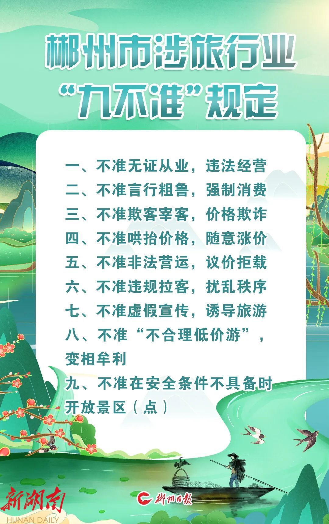 7月21日,在第二届湖南旅游发展大会“郴心服务”“引客入郴”及涉旅行业“九不准”规定系列政策措施新闻发布会上,我市正式对外发布了关于《郴州市涉旅行业“九不准”规定》。