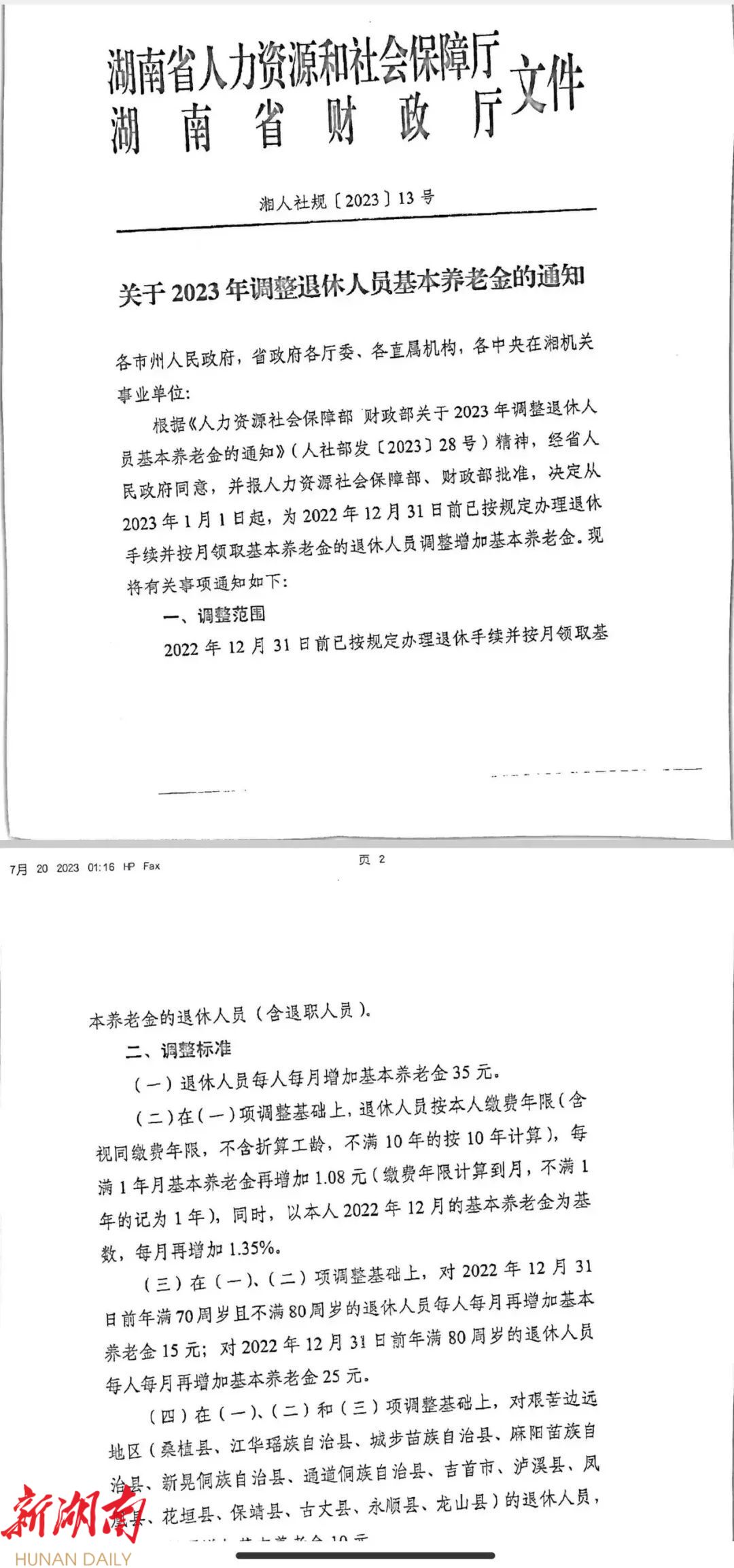 湖南退休人员期待已久的2023年养老金调整方案终于对外亮相了。7月20日,湖南省人社厅印发了《湖南省人力资源和社会保障厅 湖南省财政厅 关于2023年调整退休人员基本养老金的通知》(湘人社规【2023】13号),湖南退休人员有福了,2023年的养老金即将迎来调整。按照人力资源社会保障部、财政部和湖南省规定,湖南省2023年调整基本养老金从2023年1月1日起执行,退休人员调整增加的基本养老金在2023年7月31日前发放到位。让我们一起来看看湖南省2023年养老金调整细则↓