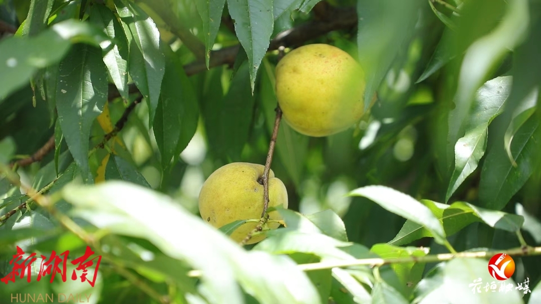 7月20日,在花垣县麻栗场镇新科村黄桃基地,低矮粗壮的桃树上,即将成熟的桃果挂满了枝头,村民们穿梭其间,查看黄桃长势,静候着丰收的到来。
