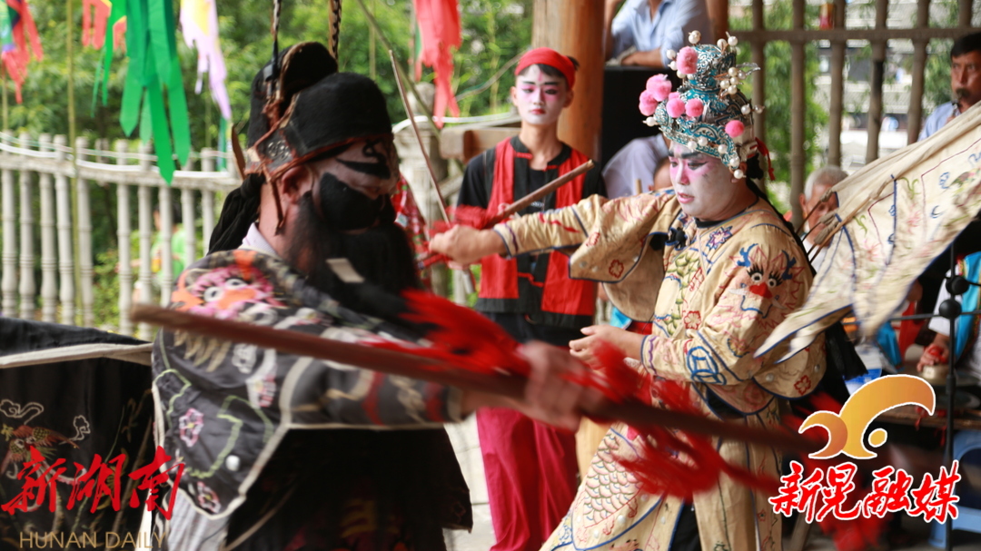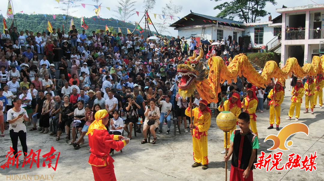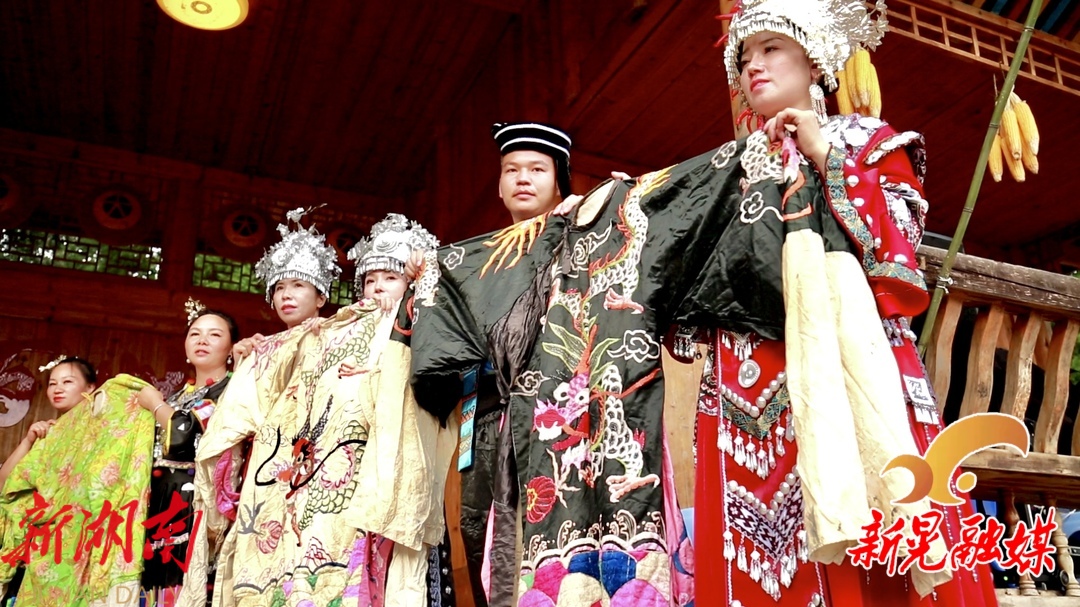 正午十分,“晒袍节”最重要的活动“晒龙袍”正式开始。苗乡青年把烂泥汉戏——苗岭高腔中绣有龙纹的戏袍小心翼翼地展开,面向太阳晾晒,同时也向现场观众展示精美的戏袍。随后,烂泥古戏班登台,传承 300 余年的烂泥汉戏——苗岭高腔压轴上演,将“晒袍节”活动推向高潮。