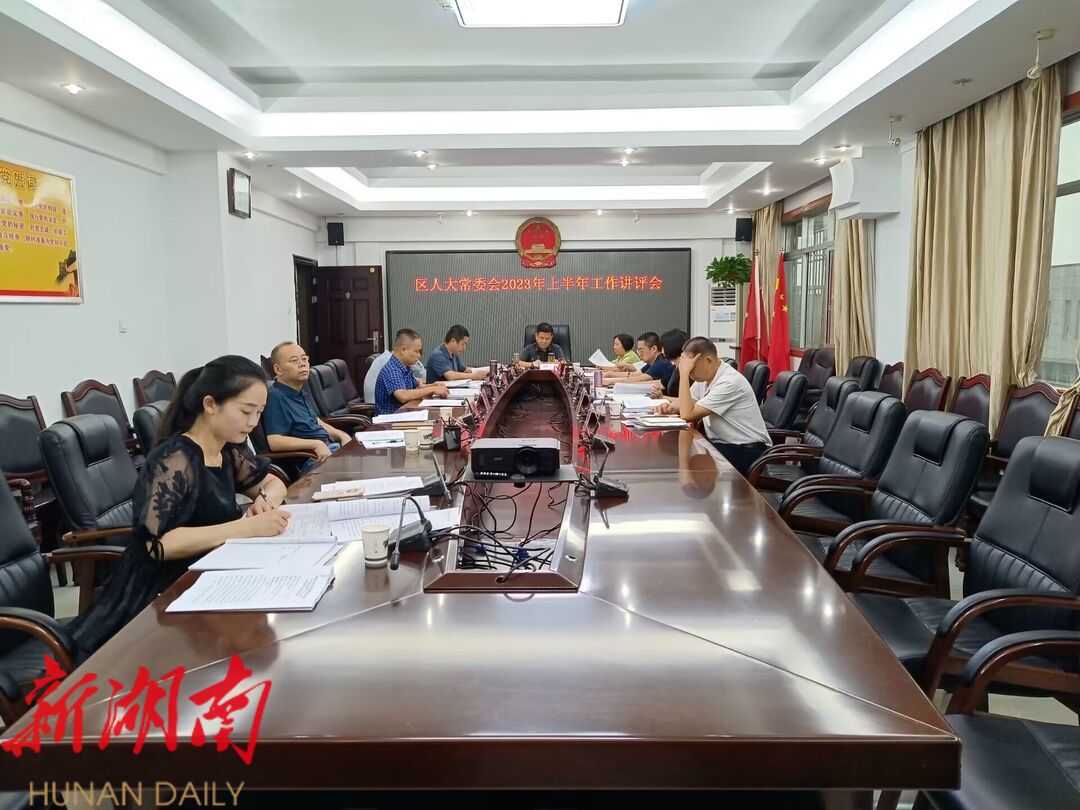 湖南日报·新湖南客户端7月26日讯(记者 解雯惠 通讯员 胡凌艳) 7月25日,永定区人大常委会召开2023年上半年工作讲评会。区人大常委会党组副书记、副主任周世建主持会议,区人大常委会副主任郑丽、石之见、赵劲松参加会议。