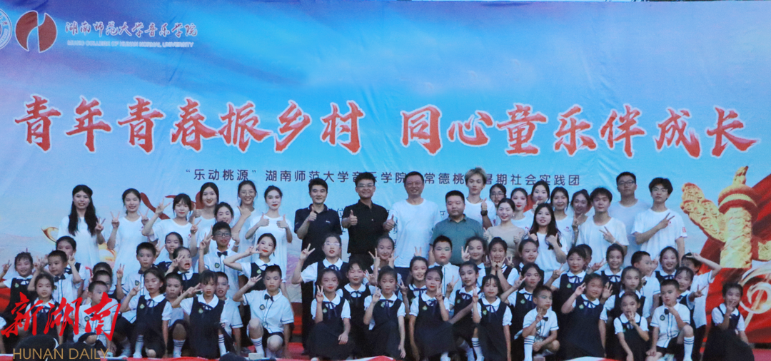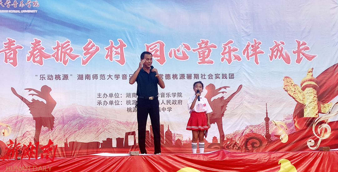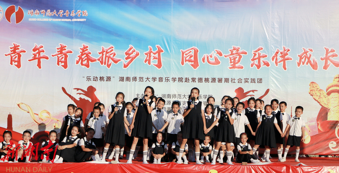 唱歌、跳舞、朗诵、吹葫芦丝、演奏口风琴……7月22日,常德市桃源县剪市镇中学热闹非凡,这里正举行一场主题为“青年青春振乡村同心童乐伴成长”的别样汇演。45名小学生在湖南师范大学“乐动桃源”实践团13名成员的带领下,将自己的所学尽情展示,吸引了附近上百名学生和家长前来观看。