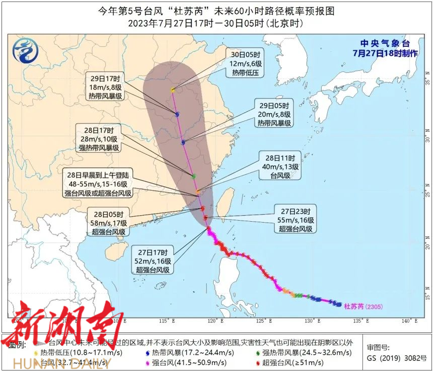 7月28日至30日受台风“杜苏芮”西移北上影响,长沙大部有中等雷阵雨、东部地区局地大到暴雨,局地伴有短时强降雨、雷雨大风等强对流天气,北风加大至3级至4级,江河湖面局地阵风5级至6级。