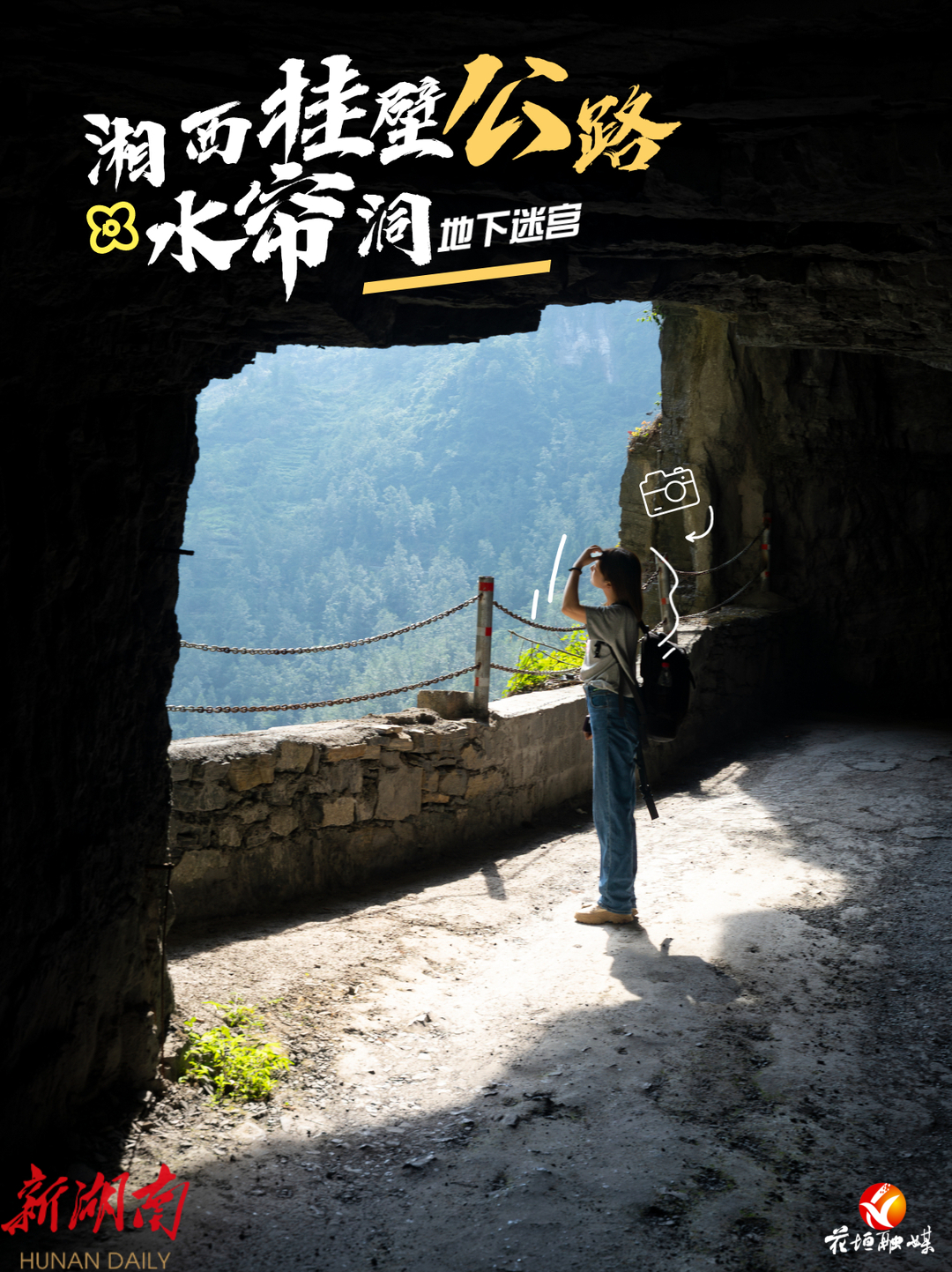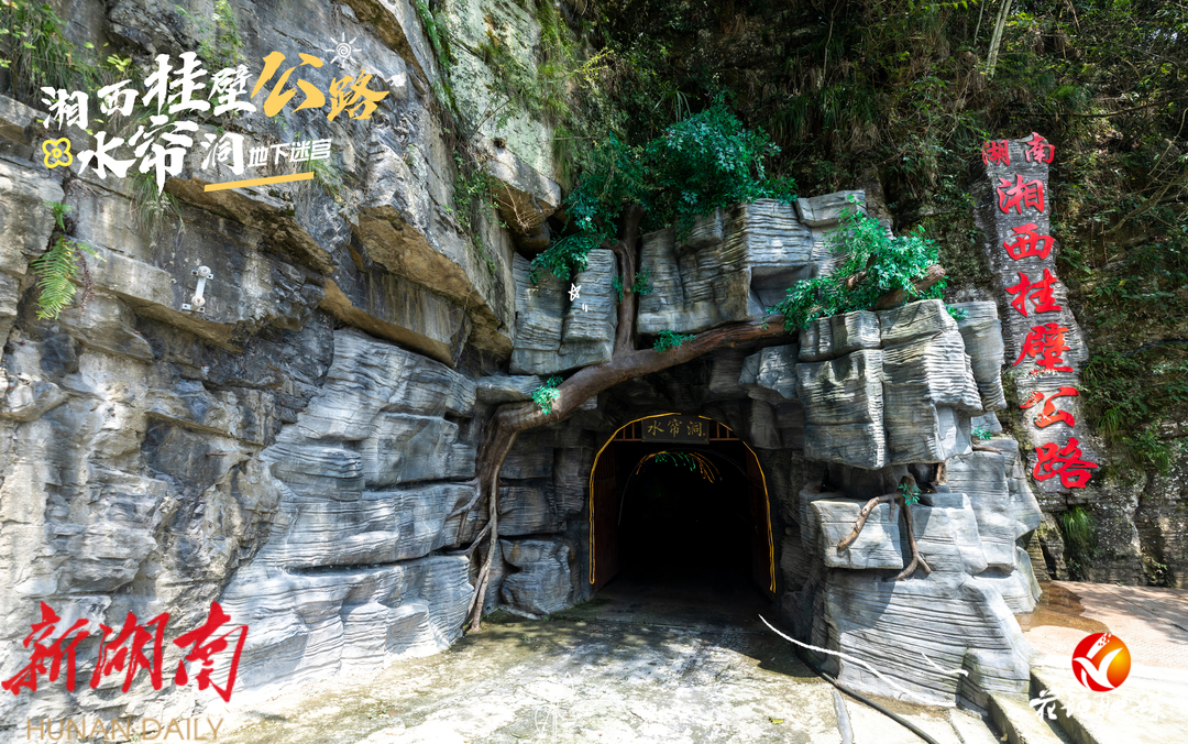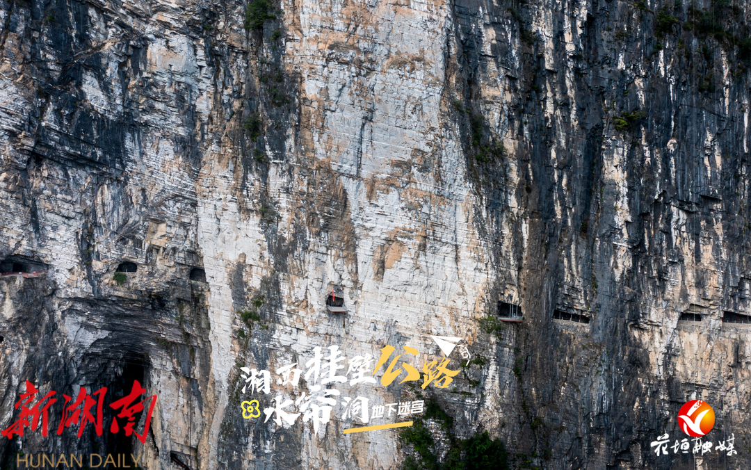 串联起“水帘洞”地下世界的是一条人工开凿的壮丽景观 ——湘西挂壁公路。它在陡峭的悬崖绝壁中凿建而成, 全长约1100米,宽度不足4米,每次只能容纳一辆车通行。