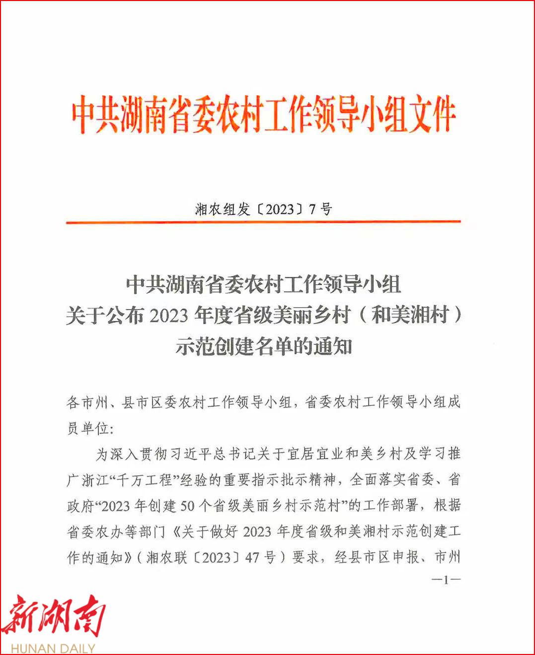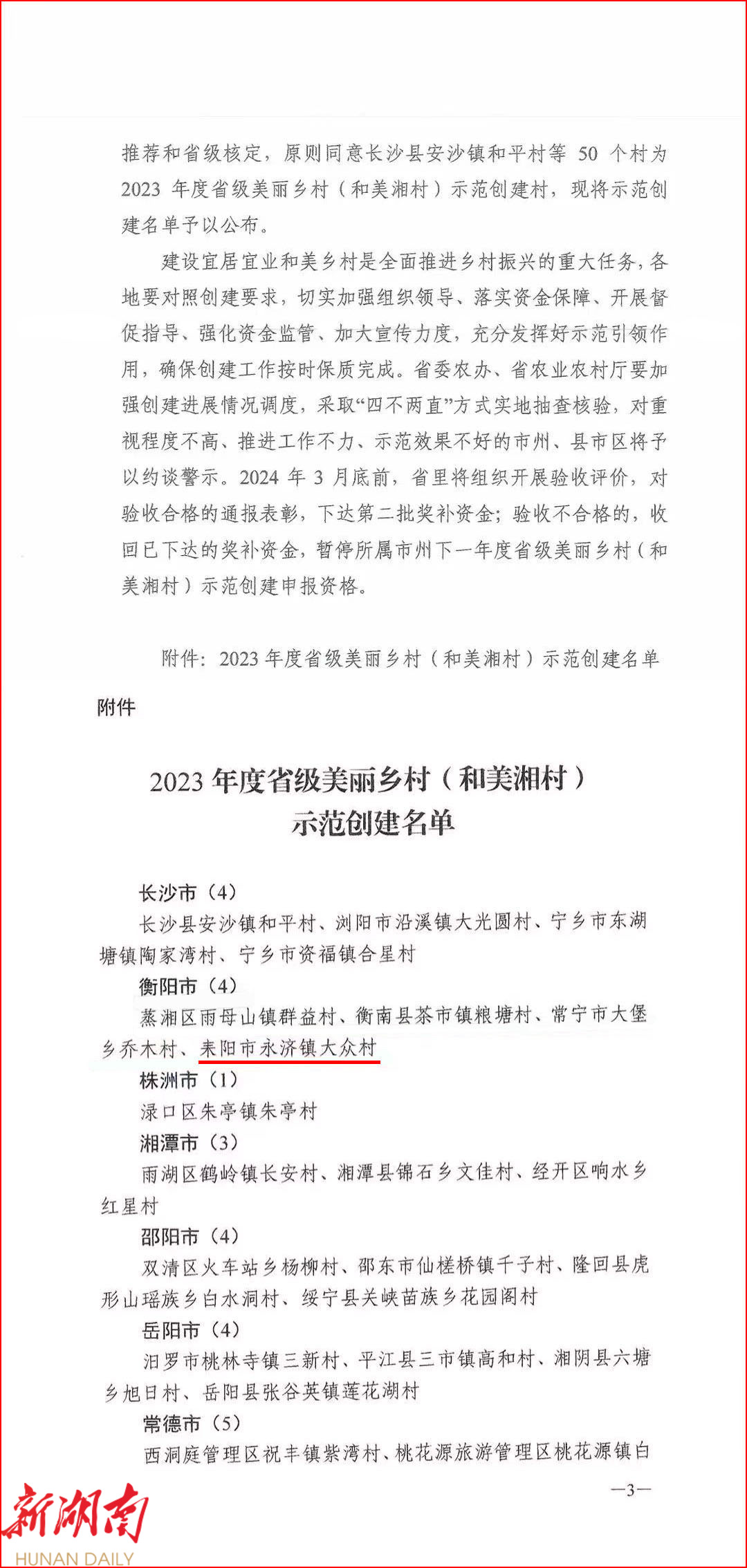 近日,中共湖南省委农村工作领导小组正式公布2023年度省级美丽乡村(和美湘村)示范创建名单,耒阳市永济镇大众村成功入选。
