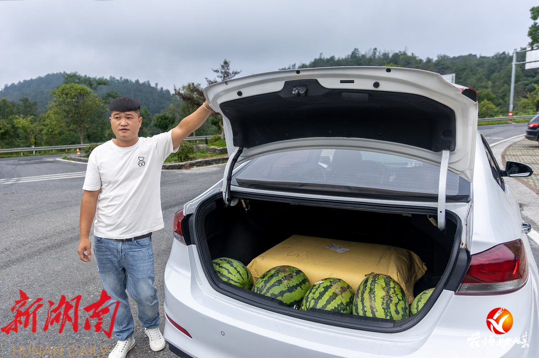 “岩锣西瓜都出名好多年了,特别好吃,所以每年西瓜熟了就到这里来买。”盛夏时节,正值吃瓜季,7月31日一早,花垣县双龙镇十八洞村村民杨新就开着车来到 209国道旁的岩锣村入村口,买上几个岩锣西瓜,准备给老丈人家送上一份“夏日清甜 ”。