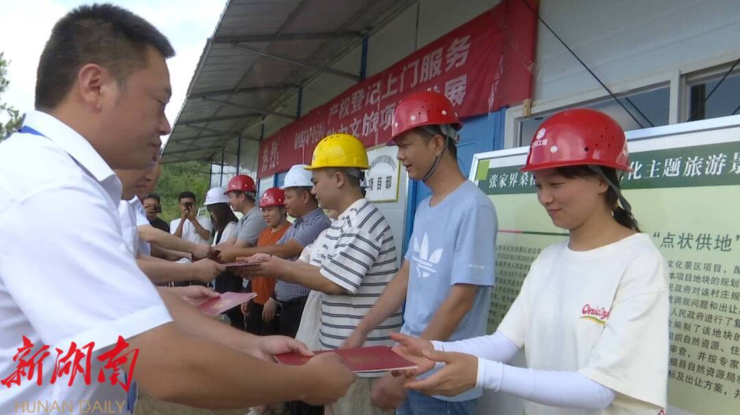 在张家界大美文化旅游投资有限公司的何家界阿巴砦红色文化旅游景区建设项目现场,县自然资源局不动产登记中心工作人员将已办结的全县首本集体建设用地出让商服用地不动产权证交到了该公司负责人手中。据悉,县不动产登记中心受理该公司登记申请后,开启了“绿色通道”,快速完成了材料审核和系统录入,在受理人员核转后,相关工作人员迅速完成核定登簿、制证缮证等工作,并在1个工作日内将不动产权证书送到了企业。