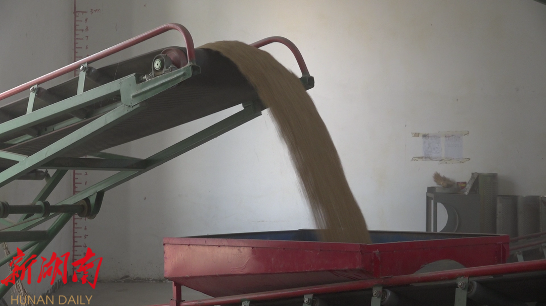 在江永县粮食购销有限公司井边粮库,满载黄金稻谷的送粮车排成长龙,前来售粮的农户手持智能一卡通在工作人员在指导下取样、检测、过磅、结算一派繁忙景象,一车车稻谷经过机器除杂后,由传送带缷入粮库,稻香弥漫了整个粮仓。