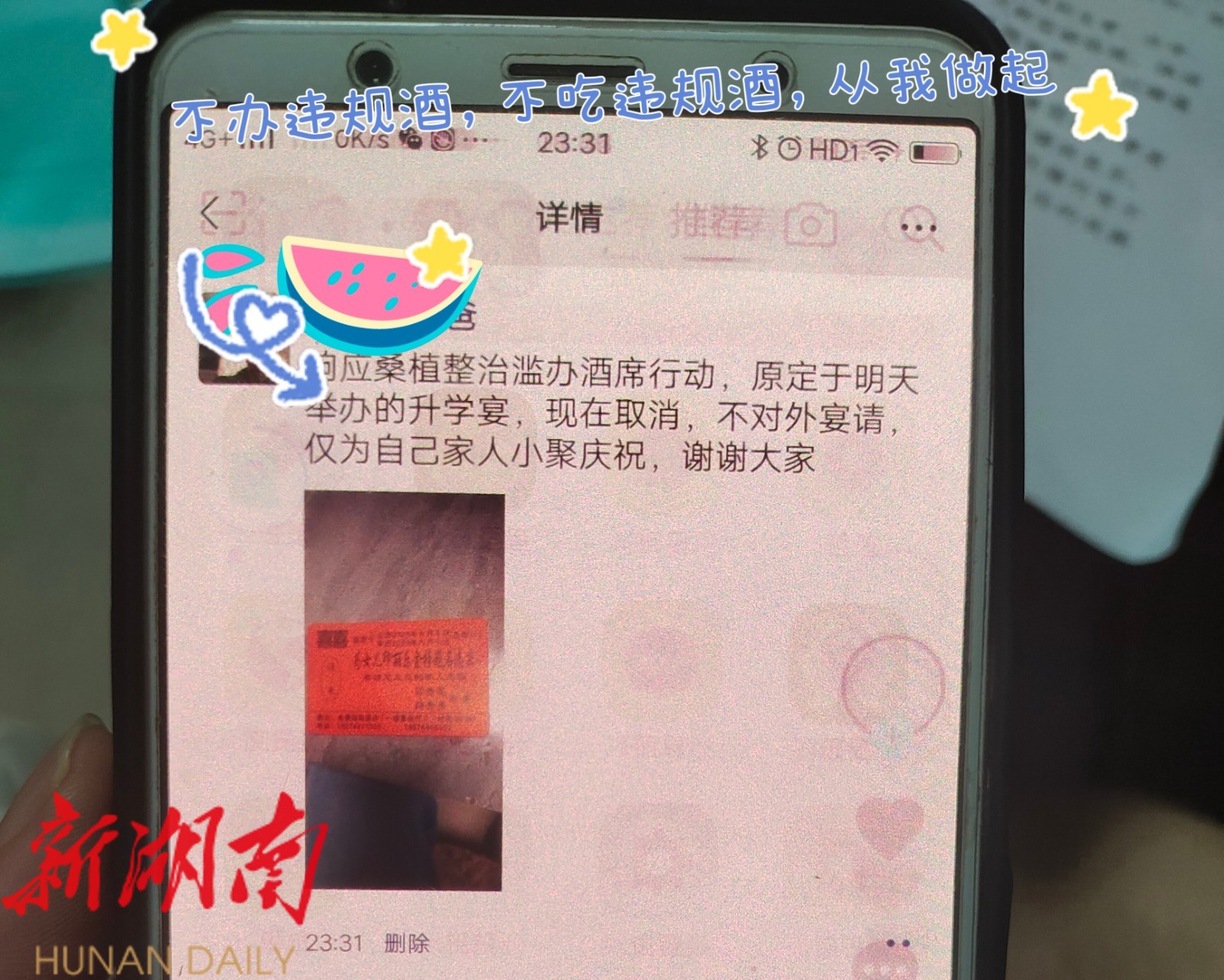 “首先祝贺您家的孩子考上理想的大学,其次也是再次向你们进行整治滥办酒席政策宣传,为了减轻群众负担,我市范围内倡导婚事新办、丧事简办,其它事情一律不办,升学宴也属于违规赈酒!希望你们能够响应号召,文明庆祝,取消升学宴。”在上洞街乡、村干部的耐心劝说下,两户农户态度逐渐缓和,表示会积极配合政府工作,并发布朋友圈宣布取消升学宴。