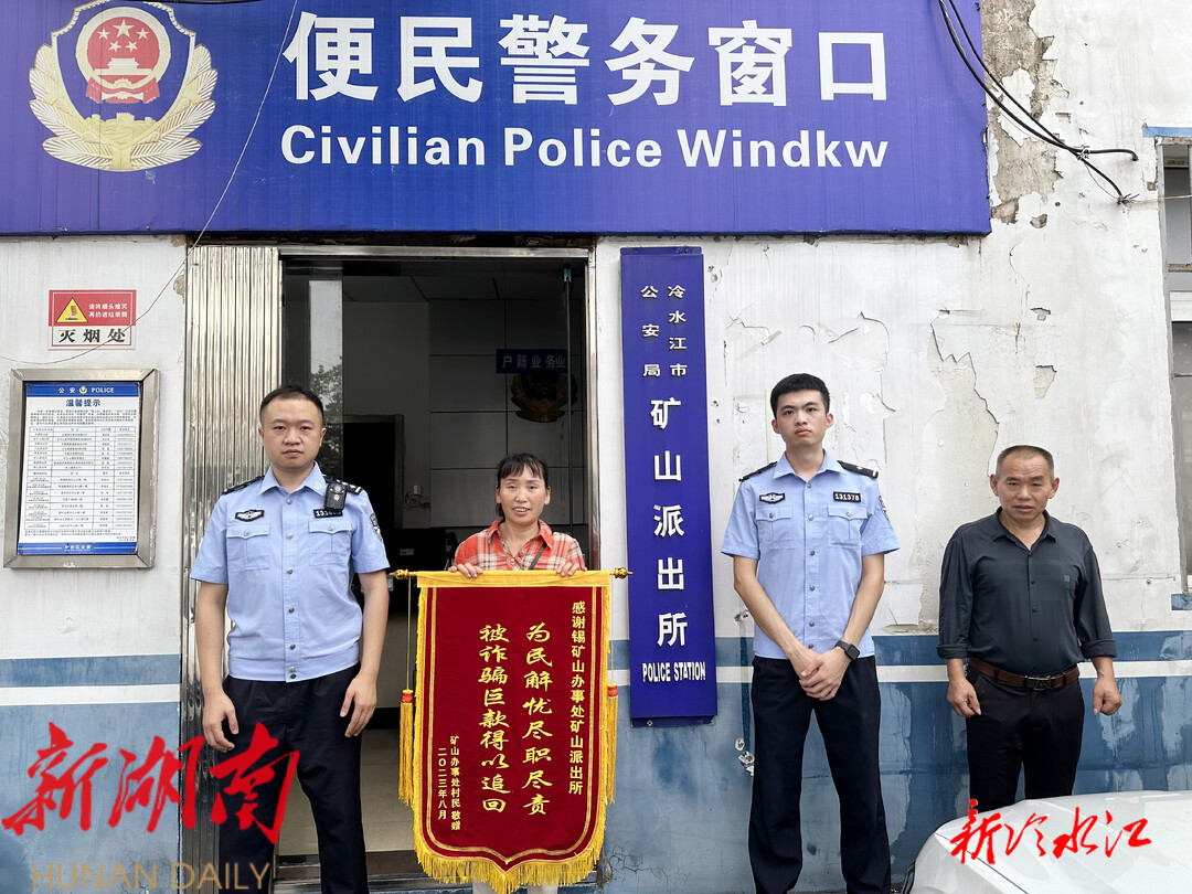 湖南日报·新湖南客户端8月9日讯(通讯员 谢继长)“感谢认真负责的矿山派出所民警,要不是因为你们帮忙,我辛辛苦苦的血汗钱可就骗走了!”2023年8月8日上午,冷水江市锡矿山办事处马井村的村民杨女士带着自己的丈夫到来矿山派出所,亲手将印着“为民解忧尽职尽责、被诈骗巨款得以追回”的鲜艳锦旗送到民警手中,感谢民警为其追回被骗的49950元存款。