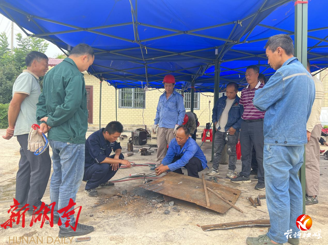 8月10日,在花垣县吉卫镇机司村村部,和麻利龙一起的20名周边村民正在焊工培训老师麻胜国的指导下,认真学习电焊工切割技术。