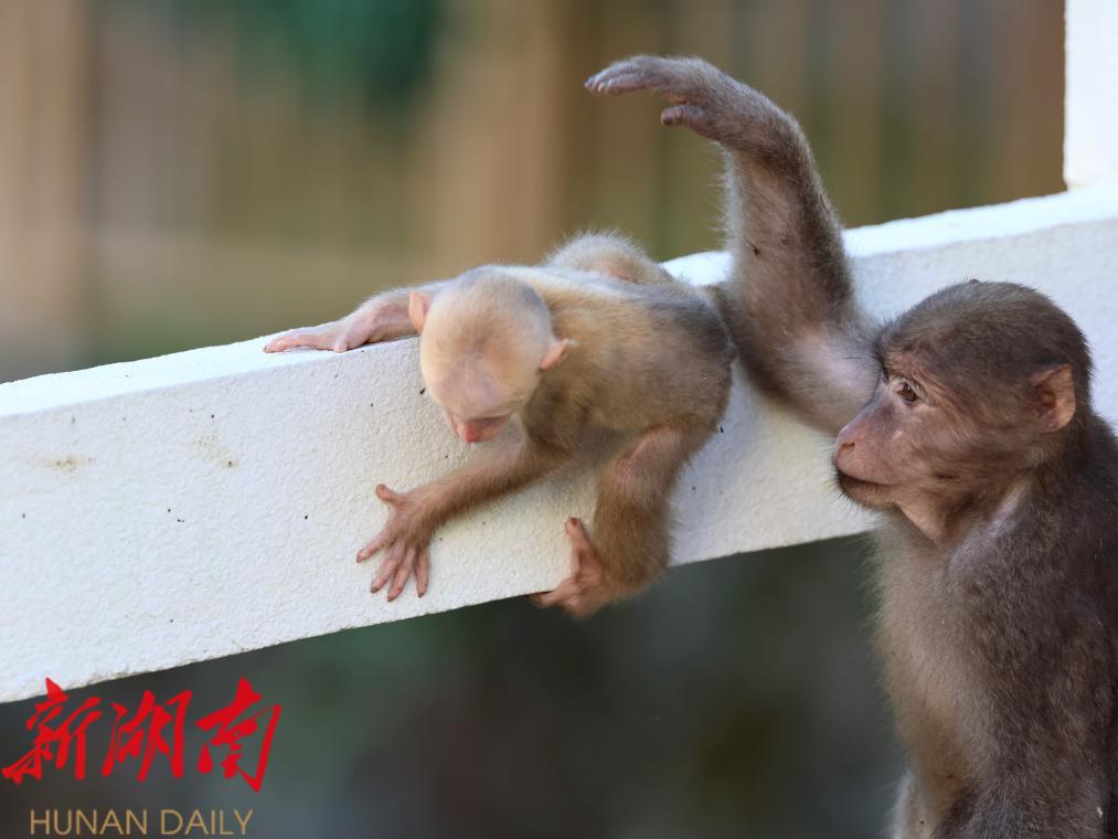 2022年7月23日,在武夷山国家公园腹地桐木村附近,藏酋猴在看护攀爬中的幼崽。新华社记者 姜克红 摄