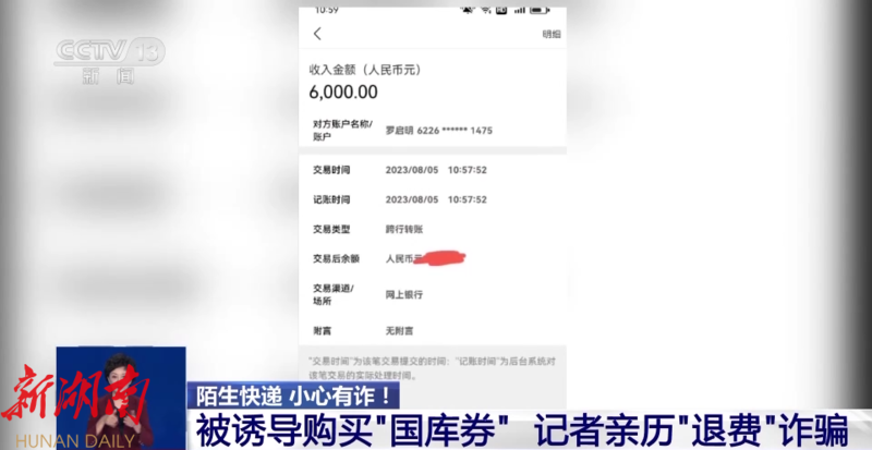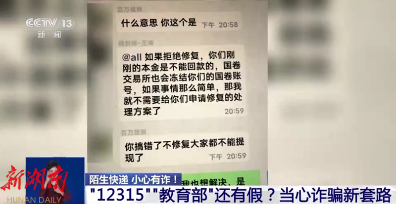 浙江平湖受害人 马女士:12315嘛,我也没多想,肯定没问题的,看见他们群里说是都退了,那我想也试试看。一开始做了两单,第一单是(购买)500(元国库券),返了100(元),第二单是(购买)1000(元国库券),返了200(元),第三单,他跟我说500、1000的没有了,只有3000、1万的,你做吗?那我就做一个3000(元国库券)的,结果直接跟说我做错了。