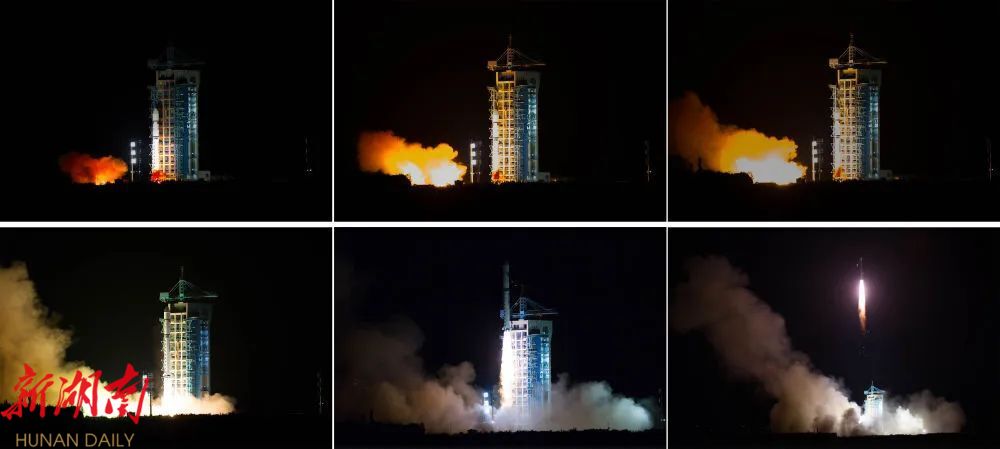 2016年8月16日1时40分,我国在酒泉卫星发射中心用长征二号丁运载火箭成功将世界首颗量子科学实验卫星发射升空(拼版照片)。