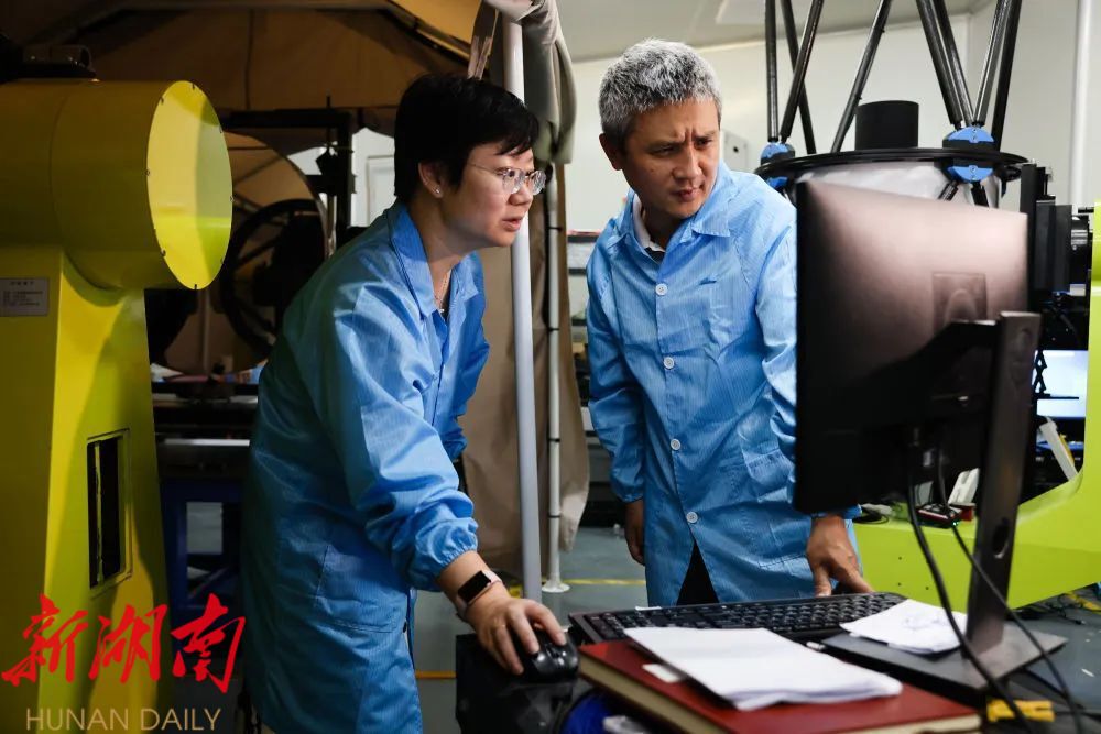 7月21日,在位于安徽合肥的中国科学技术大学先进技术研究院,彭承志(左)与任继刚教授交流卫星地面站运行情况。