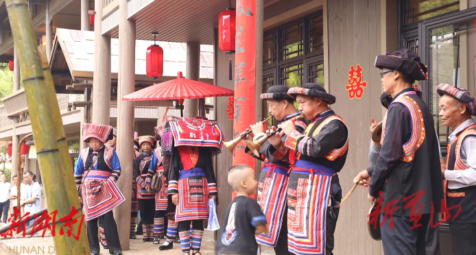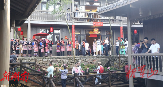 八月的云冰山景区,凉风轻拂,唢呐声声,山歌阵阵。走进古色古香的瑶寨,排排相叠依山而建,瑶族文化和现代风格、自然生态深度融合。沿着石阶一路前行,只见每栋瑶寨都集中展示了一个瑶族文化主题元素,有瑶族婚礼展示、瑶绣、打糍粑、瑶族伞舞、木狮、长鼓舞、跑堂舞、瑶浴等。漫步其中,潺潺溪流,风吹山林,鸟语蝉声,瑶寨完全融入青山竹林的怀抱,游客思古之幽情油然而生,深刻感受瑶族文化魅力。