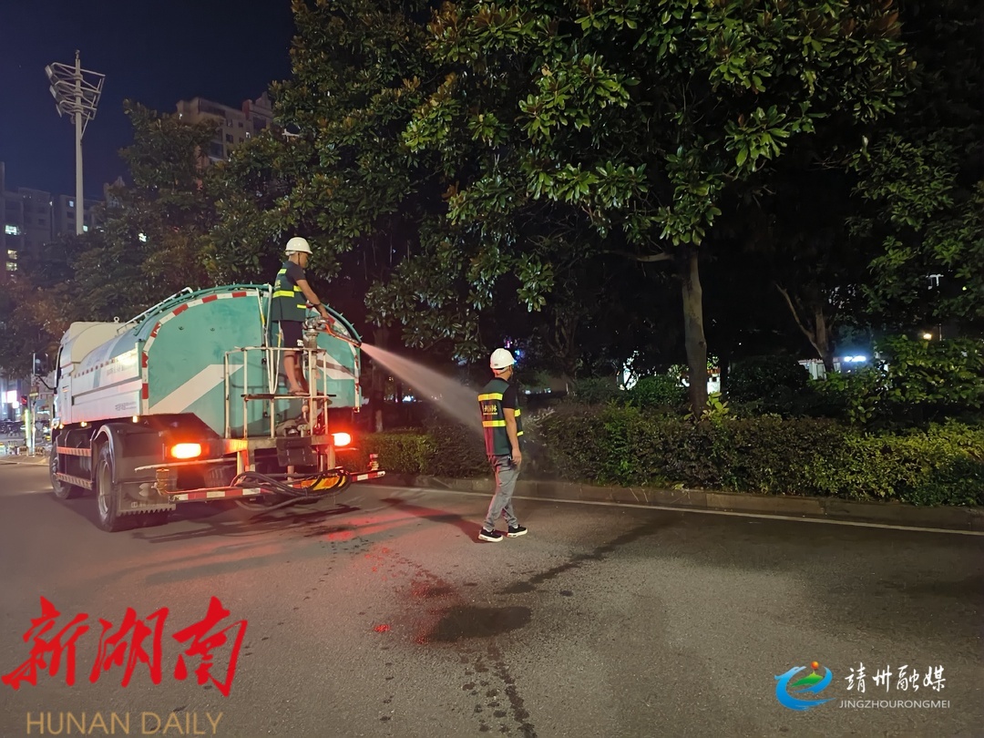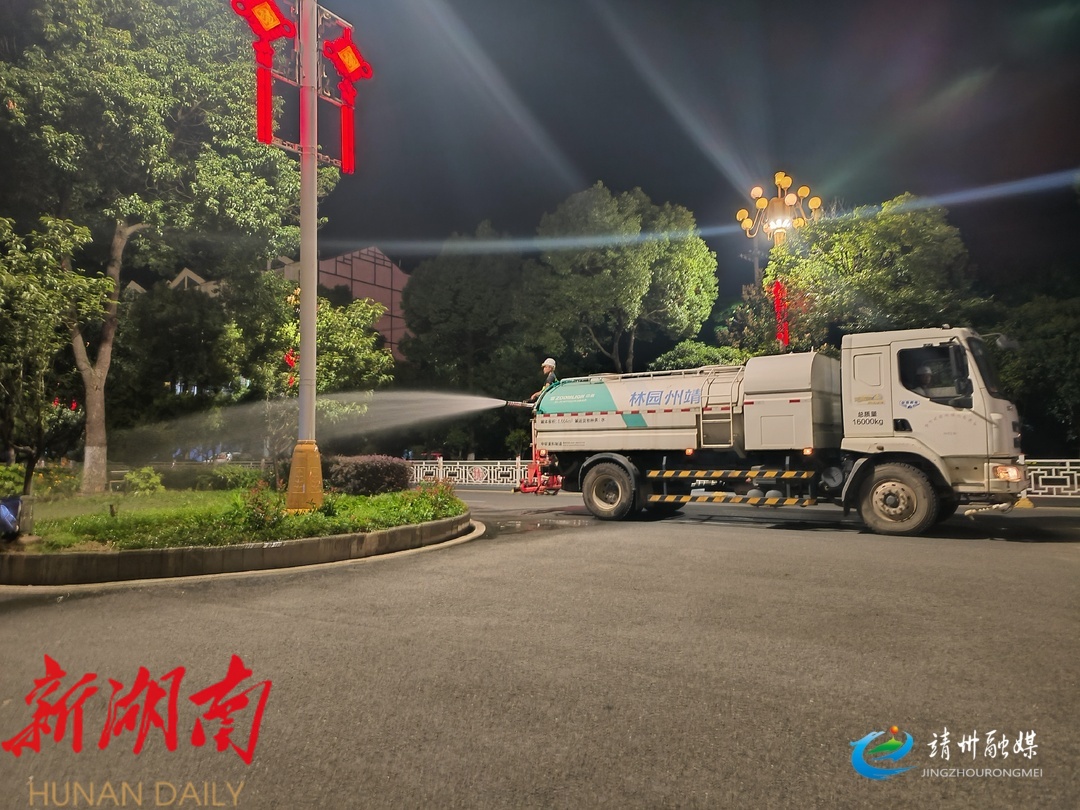 8月14日晚上9点半,在永平路路段,园林洒水车正在进行喷水抗旱作业。面对 城区 内 两万余平方米 的 绿化带 ,靖州 县 园林绿化服务中心 避开市民出行高峰期, 科学合理安排作业时间,分别在早晨五点及晚上九点半对苗木进行浇灌 ,避免高温浇水对植物根系和叶面造成灼伤。