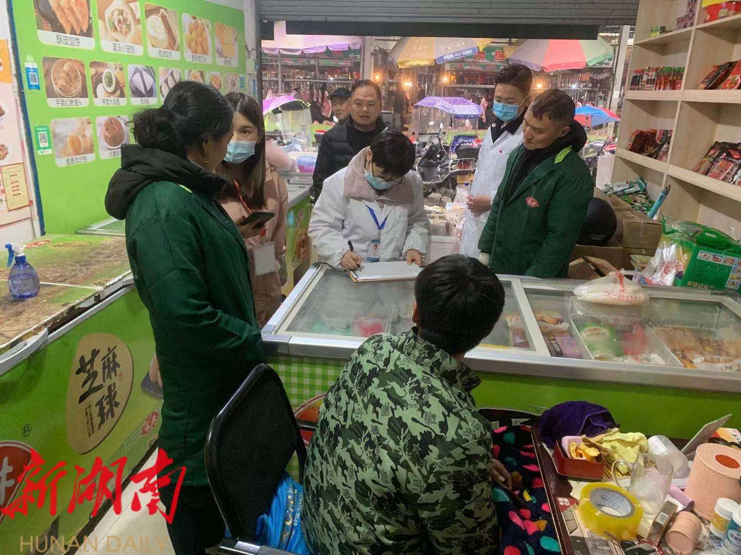 排查中,街道班子成员、社区专干、市场监管所工作人员、疾控中心人员深入辖区内商铺进行逐一摸排走访,对流通、餐饮等环节进行明确要求,突出重点,实地摸排,专项登记。 对从业人员防护、现场环境卫生、是否可以提供冷链食品货物经过消毒的证明等情况进行详细检查。另外,还详细询问了相关单位冷链食品的进货来源、产地、贮存管理、销售等情况,现场查看了食品经营许可证、质检手续等内容。 同时向经营进口冷冻食品商户进行防控安全宣传,要求经营者一律不得采购、贮存、销售无溯源凭证、来源不明的食品,做好索证索票和进货查验,保持经营场所卫生。