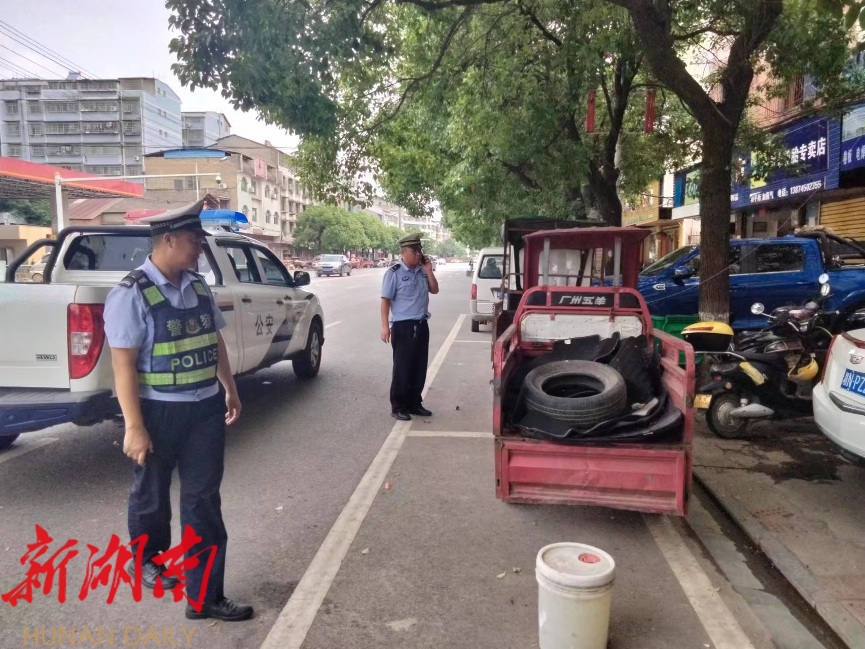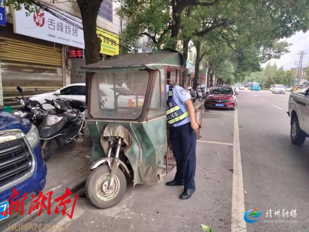 在飞山南路,民警发现一辆三轮车未规范停放在停车位内,车上堆放着各种杂物,车身有些锈蚀。附近居民也向民警反映,该车辆停放时间较长,长期霸占公共车位,给平时来附近办事想要临时停车的车主造成了不便。民警立即联系车主对车辆进行拖移。