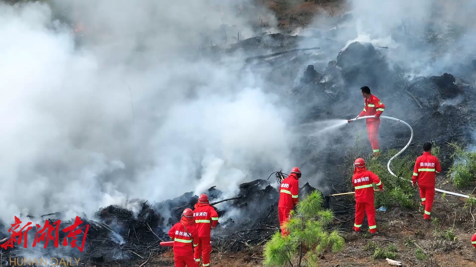 演练现场山火弥漫、浓烟滚滚,各支队伍在现场指挥部的指挥下,有序进入火场。高扬程消防水泵在附近的水源地架设成功,消防水枪喷出高压水柱,最大程度对火势进行压制;救火队员身背负式喷雾器、风力灭火机、2号工具等灭火装备清理火场,整个演练过程紧张有序。二十分钟后,在县、镇、村20支队伍,210余人的联合作战下,现场火势得到有效控制,演练圆满完成。