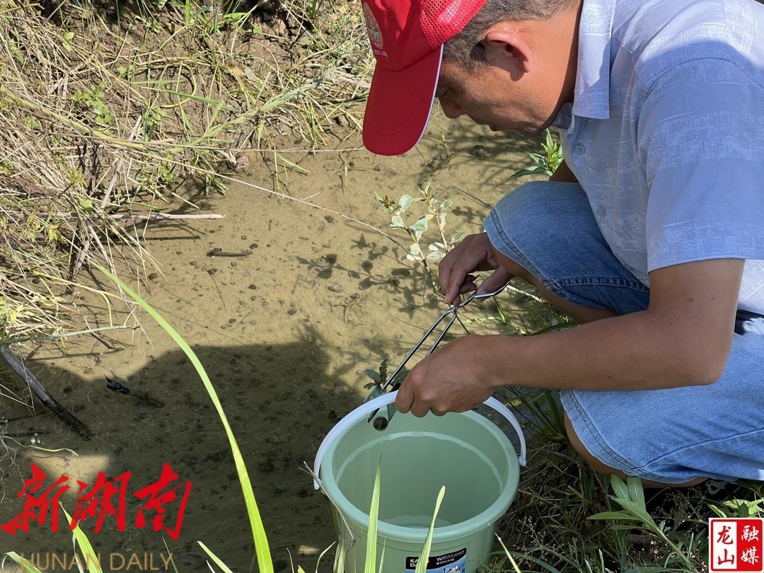 龙山县融媒体中心8月24日讯(记者 黄超 通讯员 刘兵 陈甜 彭宇)8月23日,县农业农村局联合石牌镇人民政府在上母、下池等村(社区)开展科学高效的“灭螺行动三步走”, 打好福寿螺“清缴战”。
